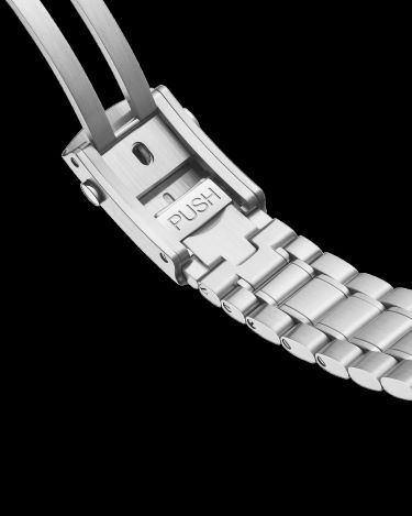as a 6 o’clock date window that blends with the colour of the dial. The hour and